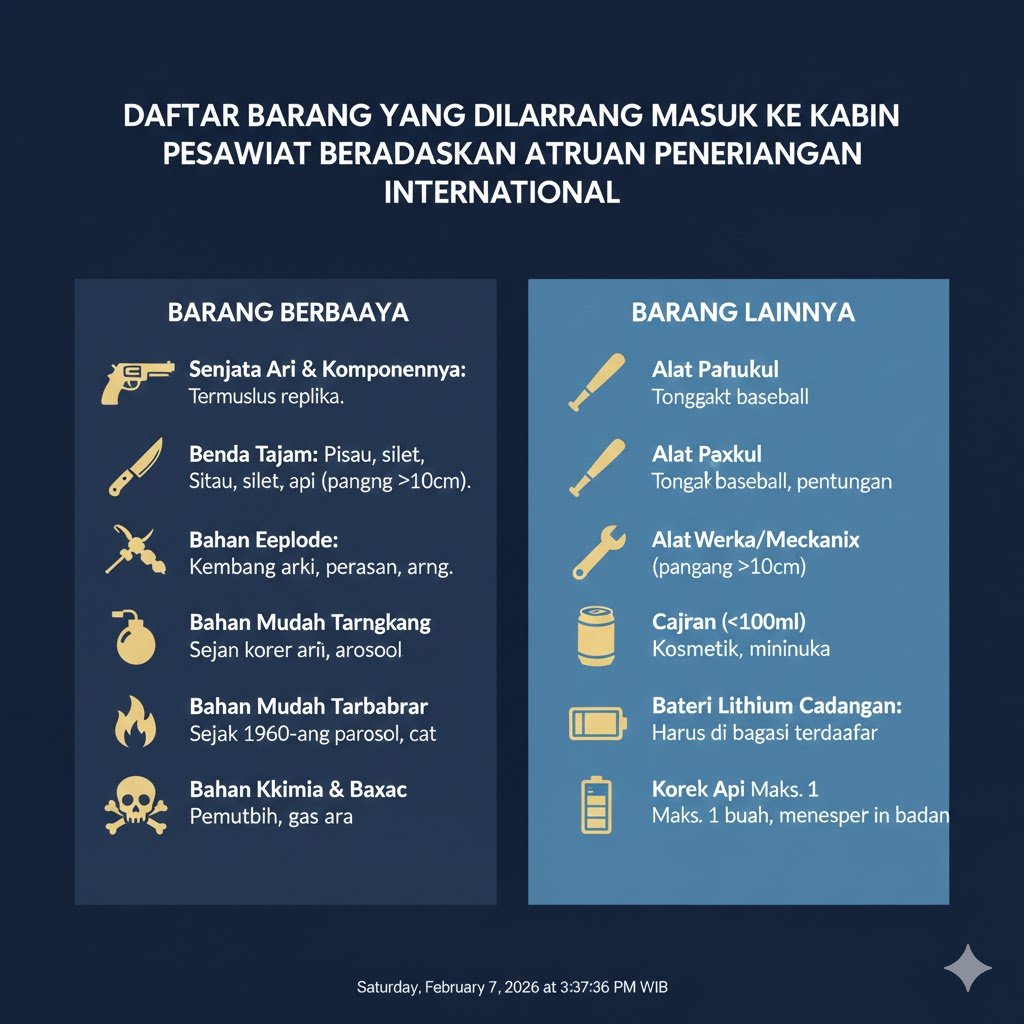 Keamanan penerbangan merupakan prioritas utama dalam industri transportasi udara global. Setiap maskapai dan otoritas bandara di seluruh dunia mematuhi standar ketat guna memastikan keselamatan penumpang dan awak kabin. Memahami daftar barang yang dilarang dibawa ke dalam kabin pesawat sangatlah penting agar proses pemeriksaan di gerbang keamanan atau Security Check Point berjalan lancar tanpa hambatan. Berikut adalah panduan mengenai barang-barang yang tidak diperbolehkan masuk ke area penumpang berdasarkan regulasi internasional.