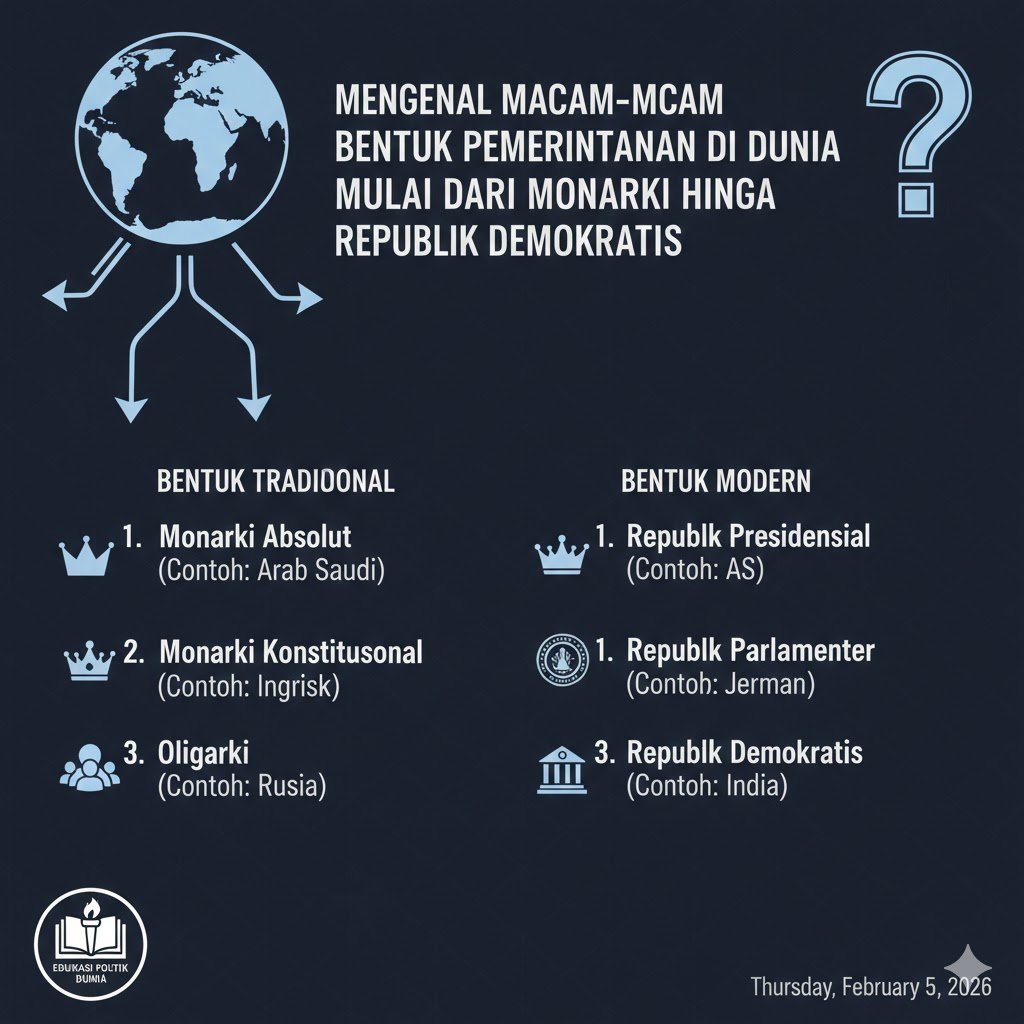 Memahami berbagai bentuk pemerintahan ini membantu kita melihat bagaimana setiap negara berupaya mencari keseimbangan antara ketertiban, keadilan, dan kesejahteraan. Meskipun tidak ada sistem yang benar-benar sempurna, pergeseran global menuju sistem yang lebih transparan dan partisipatif menunjukkan bahwa suara rakyat tetap menjadi kekuatan utama dalam peradaban manusia modern.
